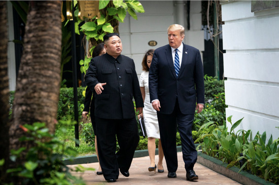 2019年6月30日,朝鲜领导人金正恩与美国总统特朗普在朝鲜和韩国之间的军事分界线——板门店共同警卫区域南侧举行会谈。